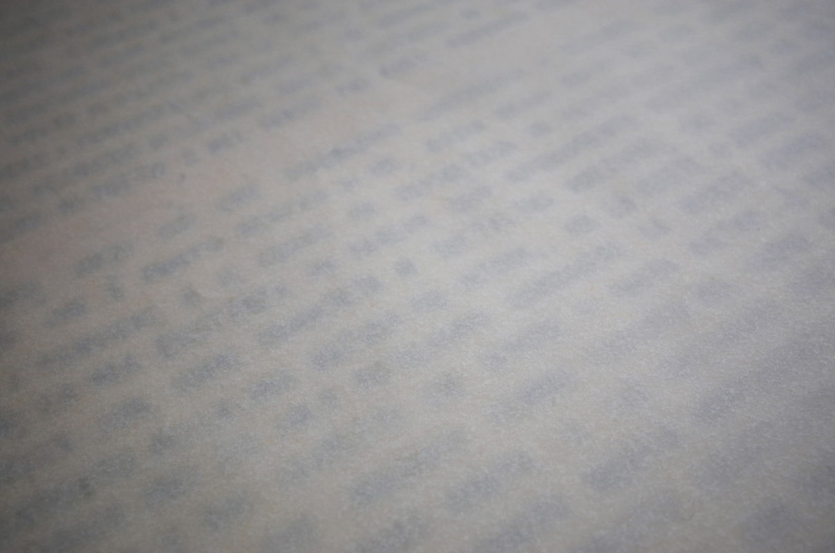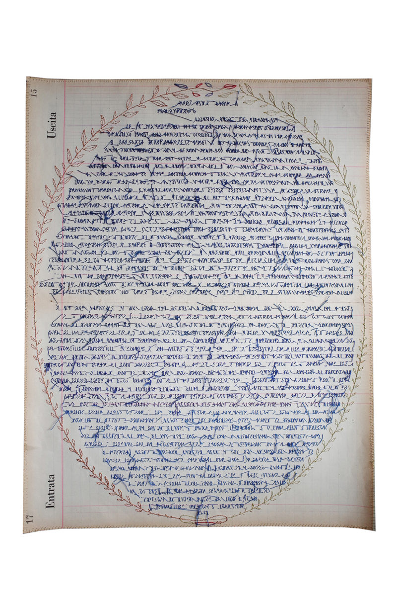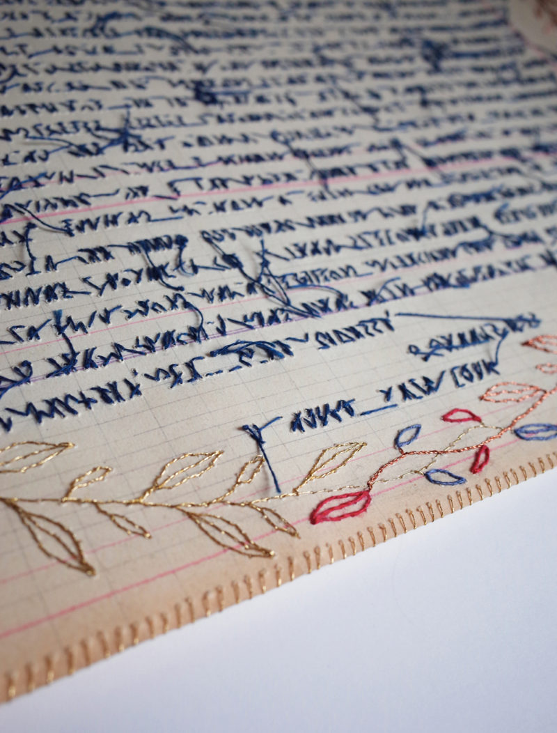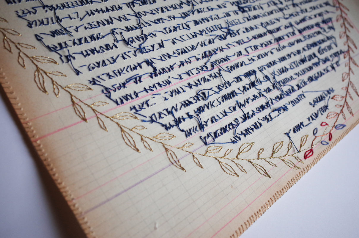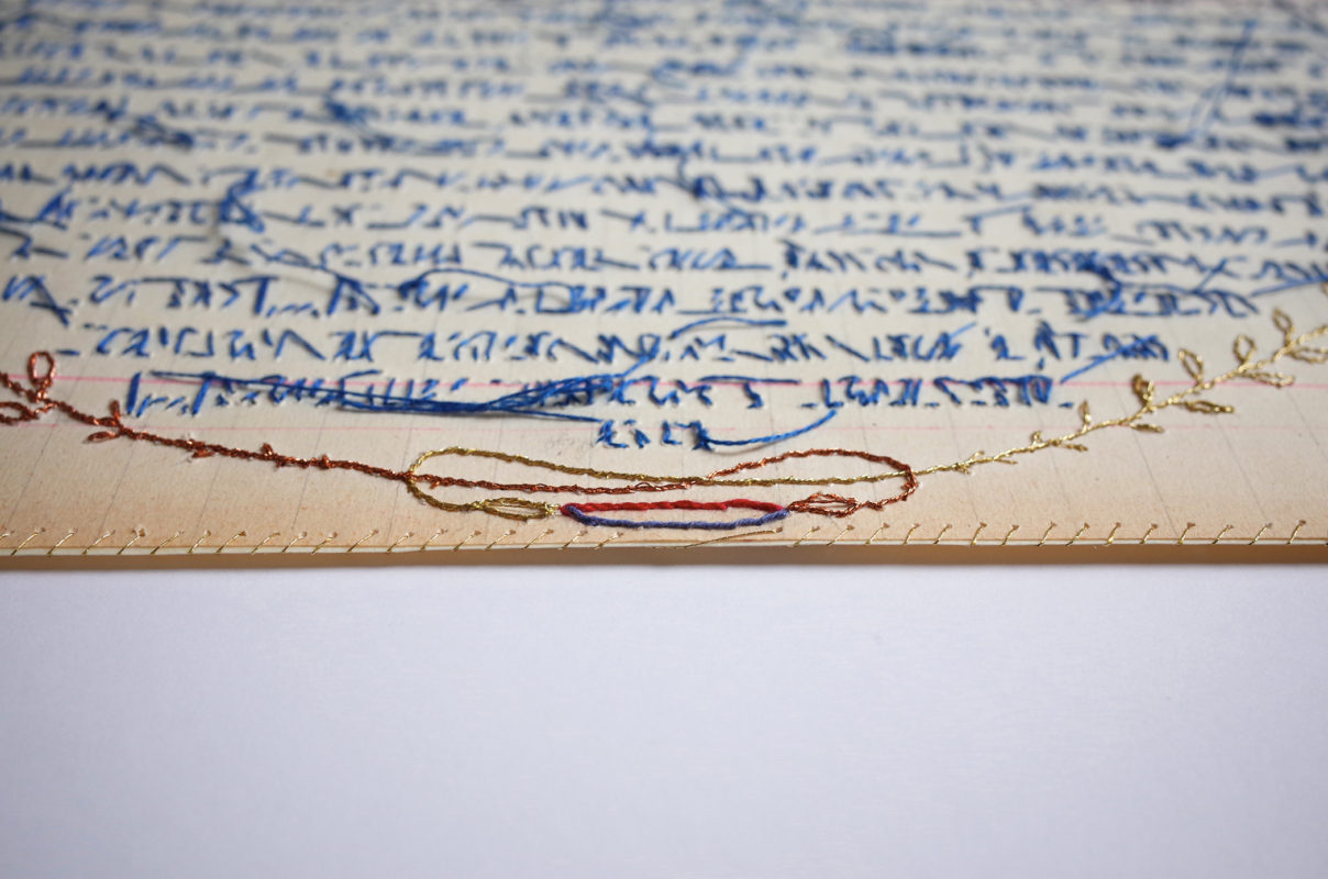 A RAINER MARIA RILKE - Ricamo a mano su foglio di carta di un vecchio registro di cassa, unito ad un foglio di carta pergamena attraverso il filo d'oro.